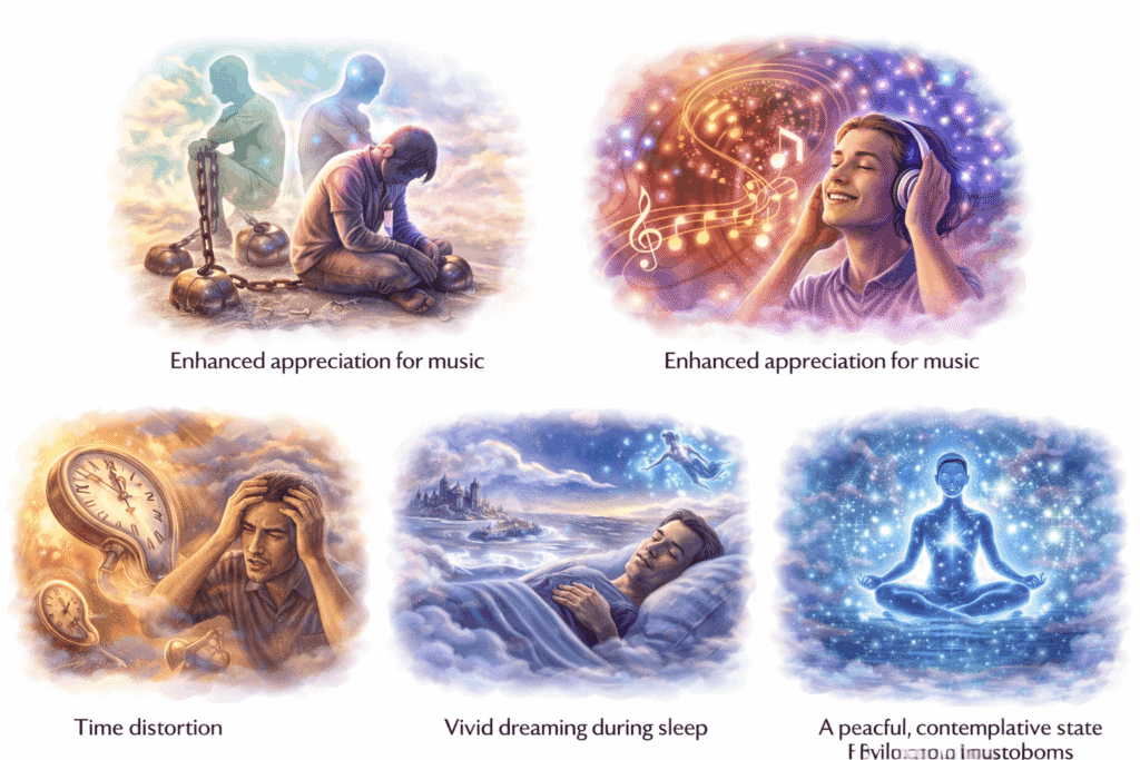 Colors may appear slightly more vibrant, but visual changes rarely approach the kaleidoscopic patterns of classical psychedelics. Many users describe maintaining awareness and control throughout.
