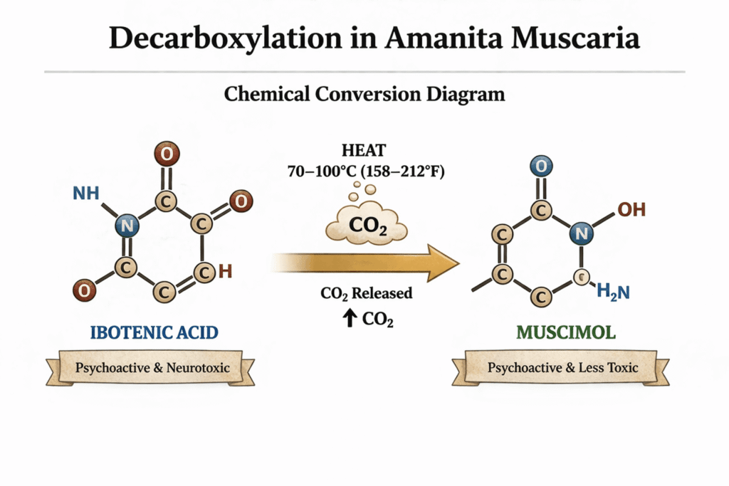 Decarboxylation is the process that makes Amanita muscaria safe and effective. It converts ibotenic acid, the compound responsible for nausea and unpleasant side effects, into muscimol, the calming compound people actually want. This happens through heat and acidic conditions, and the quality of this conversion is the single biggest factor separating a good Amanita muscaria product from a bad one.